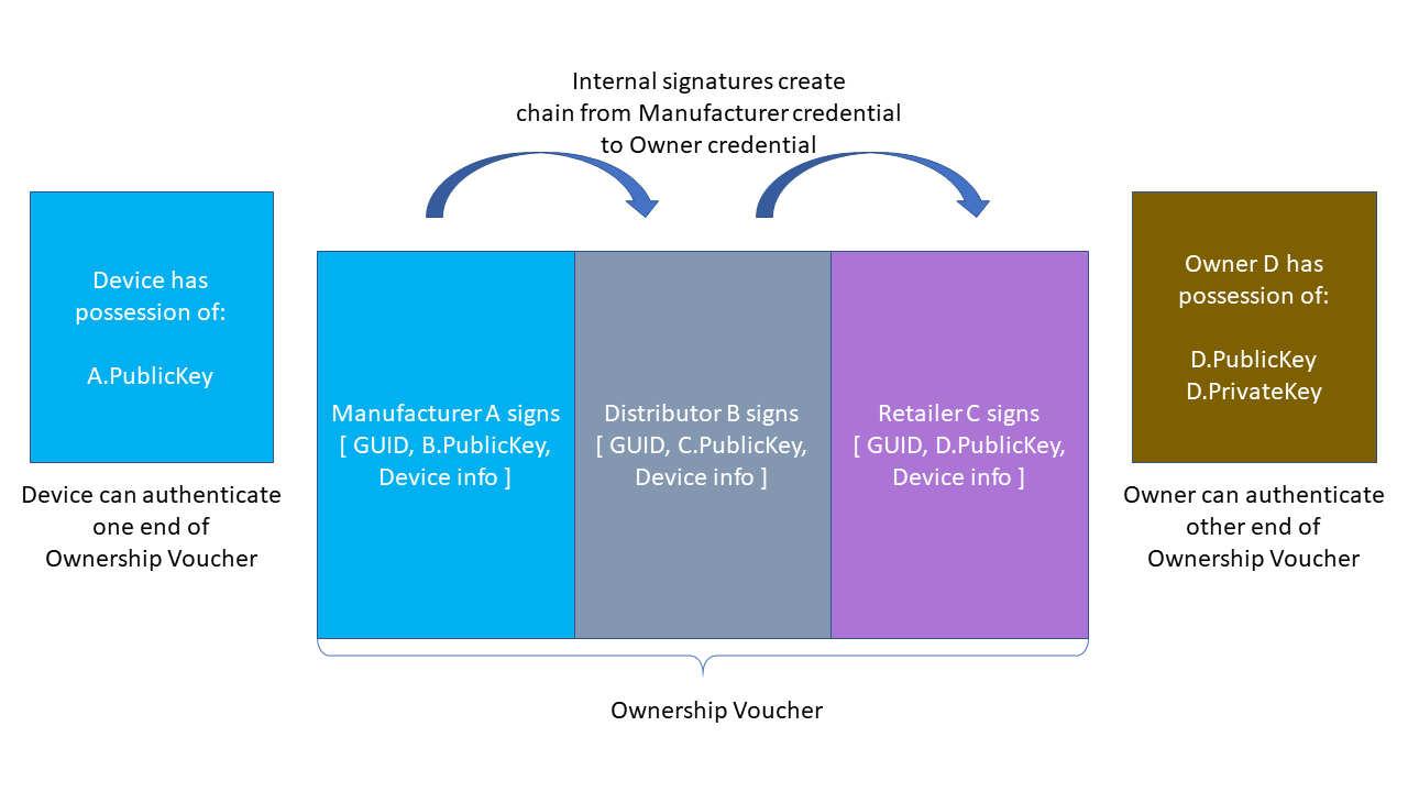 FIDO Device Onboard works by establishing the ownership of a device during manufacturing, then tracking the transfers of ownership of the device until it is finally provisioned and put into service. In this way, the device onboarding problem can be thought of as a device "transfer of ownership" or delegation problem. In a common situation for FIDO Device Onboard that uses the "untrusted installer" model, an initial set of credentials and configuration data is configured during manufacturing. Between when the device is manufactured and when it is first powered on and given access to the Internet, the device may transfer ownership multiple times. A structured digital document, called an Ownership Voucher, is used to transfer digital ownership credentials from owner to owner without the need to power on the device.