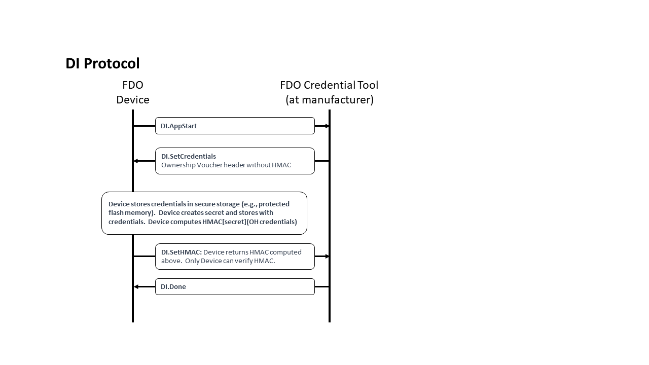 FIDO Device Onboard works by establishing the ownership of a device during manufacturing, then tracking the transfers of ownership of the device until it is finally provisioned and put into service. In this way, the device onboarding problem can be thought of as a device "transfer of ownership" or delegation problem. In a common situation for FIDO Device Onboard that uses the "untrusted installer" model, an initial set of credentials and configuration data is configured during manufacturing. Between when the device is manufactured and when it is first powered on and given access to the Internet, the device may transfer ownership multiple times. A structured digital document, called an Ownership Voucher, is used to transfer digital ownership credentials from owner to owner without the need to power on the device.