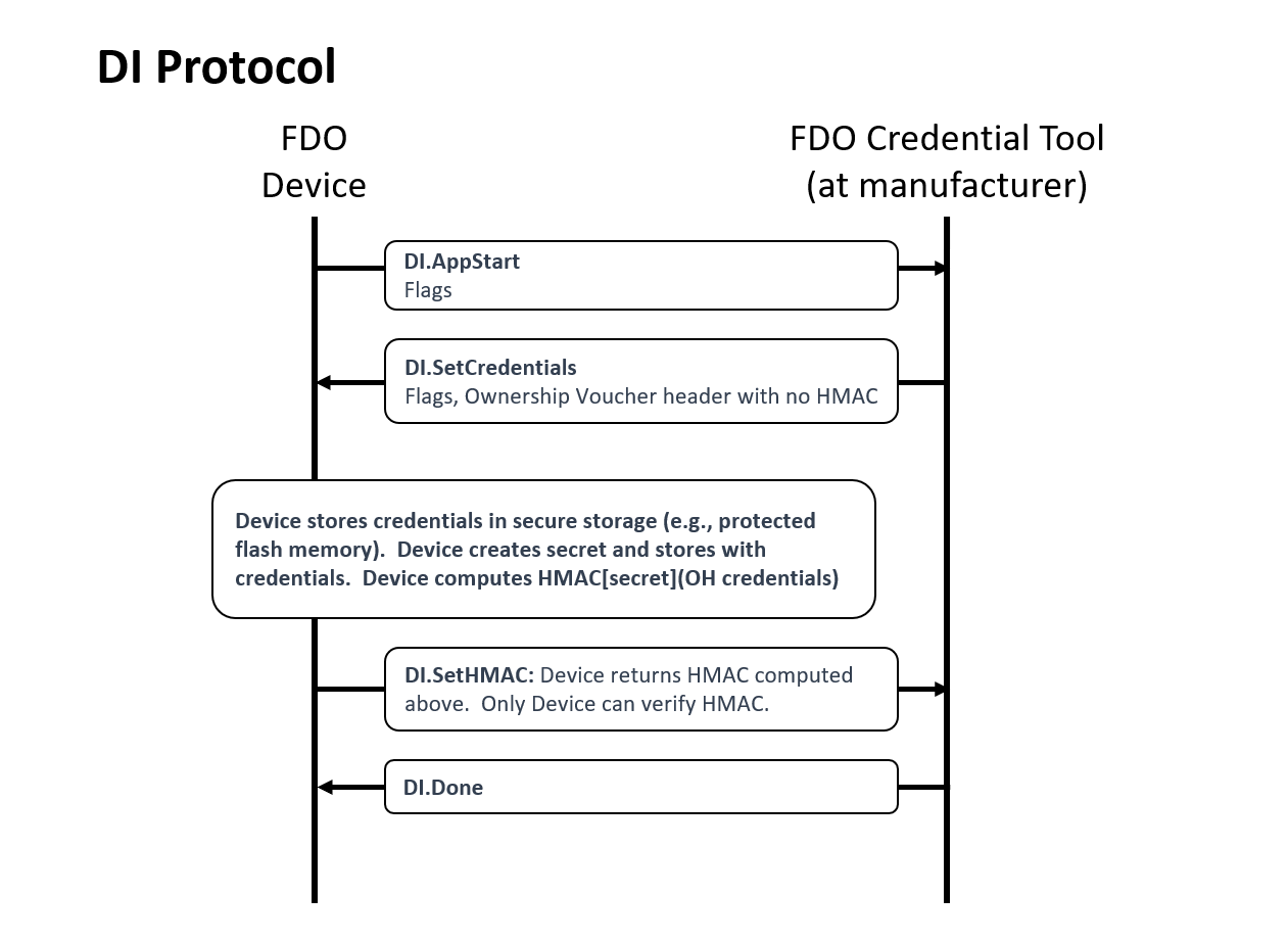 The Ownership Voucher HMAC, passed in the DI protocol, references the initial Device Certificate. This means that the ECDSA key and certificate must be programmed before the Device Initialize protocol is run. The Manufacturer is trusted to match the Device certificate information to the required DI protocol fields. Subsequent to this, the Ownership Voucher HMAC (OwnershipVoucher.hmac) is used to detect if the Device Certificate is changed in the supply chain.
