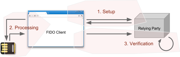 Setup: In this phase, the FIDO Client contacts the relying party and obtains a challenge. Using the challenge (and possibly other data obtained from the relying party and/or prepared by the FIDO Client itself), the FIDO Client prepares a request message for the U2F Token.