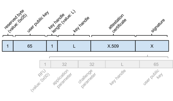 This message is output by the U2F token once it created a new keypair in response to the registration request message. Note that U2F tokens SHOULD verify user presence before returning a registration response success message (otherwise they SHOULD return a test-of-user-presence-required message - see above). Its raw representation is the concatenation of the following: